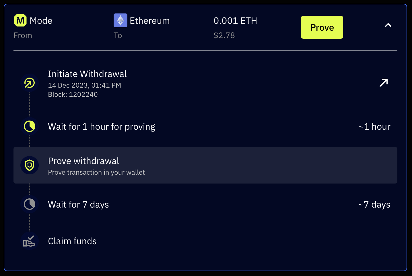 Now click <mark style="color:purple;">**`Prove`**</mark> and submit the transaction, this will start the[ 7 day waiting period for the withdrawal.](#user-content-fn-1)[^1]